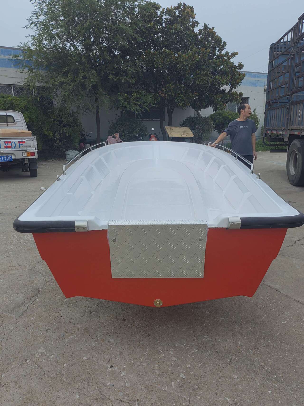 此款冲锋舟主体材质为通用型不饱和聚酯树脂,增强材料:玻璃纤维及树脂、胶衣。因此具有高强硬度和 一定的弹性。