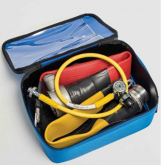 充气管道救援套组的设计和开发旨在提供一种简单而有效的方式,使用标准长度的消防水带提供下游安全吊臂或浮动救援辅助设备。充气管道救援套组充气系统可使消防水带两端密封,尾部带2个密封件,公头末端为黄色,以便清晰识别并在使用时增加可视性。该系统的工作压力为1.5巴,并使用系统提供的充气套件进行充气,该系统配有预设3.5巴的压力调节器。母头的尾巴