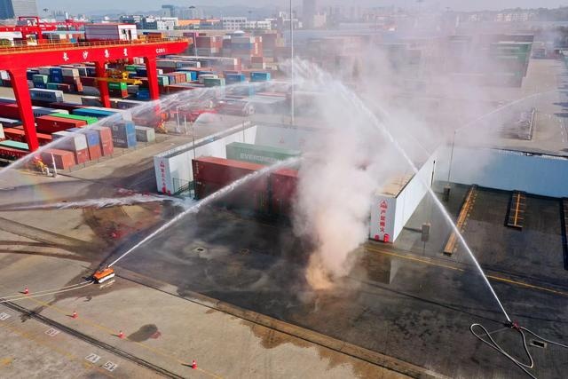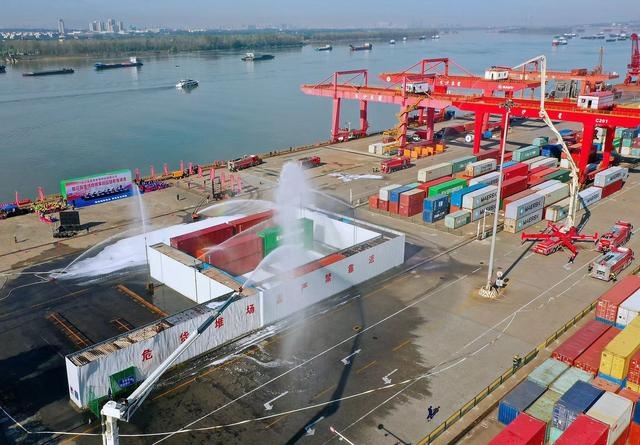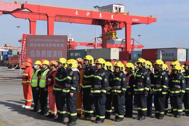 这是由省湘水集团指导,湖南省港务集团主办的一次烟花爆竹集装箱堆场燃爆事故应急救援演练。