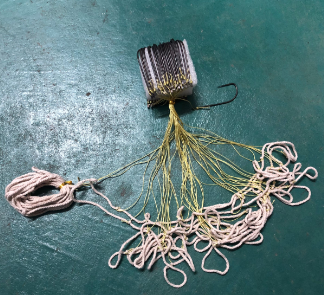 工艺流程参数:勾体粗2.2mm外径26.8mm长度72.8mm,单枚净重3.14g,一套滚钩50枚,长度约5米,主线采用2.5mm回笼线,子线采用双绞线
