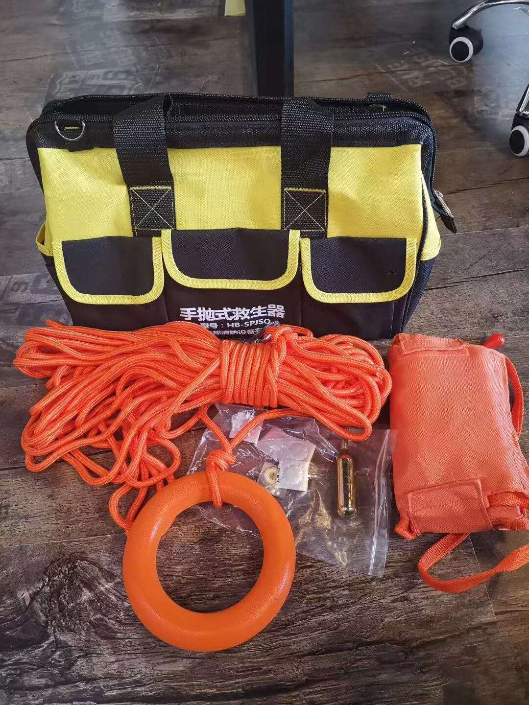 可远距离投掷,可自动充气。每套配置4 枚手抛弹头,弹头内置自动救生圈,每发弹头落水2.9秒内自动打开形成具有浮力155N的救生圈。配置直径8 毫米,长度30米水域救生绳一根。救生圈更换配件可实现多次重复使用。 配置:手抛弹头。水域救援绳。水域救援手环。安全钩。